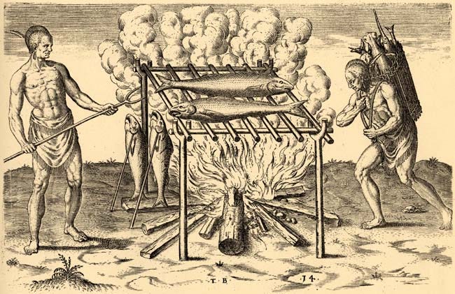 When the Spanish arrived in the Caribbean islands, the natives used to cook their meat in two ways: either directly over fire, or they would create a frame of wood and slow roast it over indirect heat and smoke.
