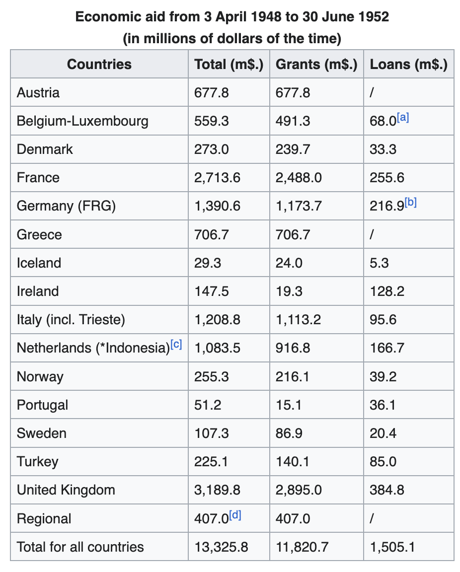 George C Marshall, the US Secretary of State at the time, introduced the European Recovery Program, also known as the Marshall Plan. Over 4 years, from 1948 - 1952, a total of $13 billion was given to 14 countries in Grants and Loans. This equates to about $175 billion in today’s money.